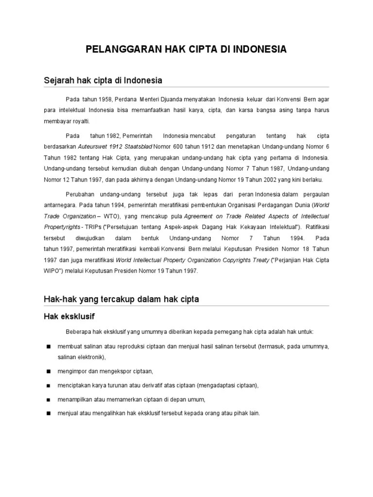 Sebagai contoh, rustina zahra, seorang novelis yang. Ciptaan atau barang hasil pelanggaran hak cipta atau hak terkait, sebagaimana dimaksud dalam ayat. Pada tahun 2018 terjadi kasus pencatutan karya cipta lagu karna su. Salah satu contoh kasus pelanggaran hak paten yang terjadi di indonesia. Untuk mendapatkan perlindungan melalui hak cipta, tidak ada keharusan.